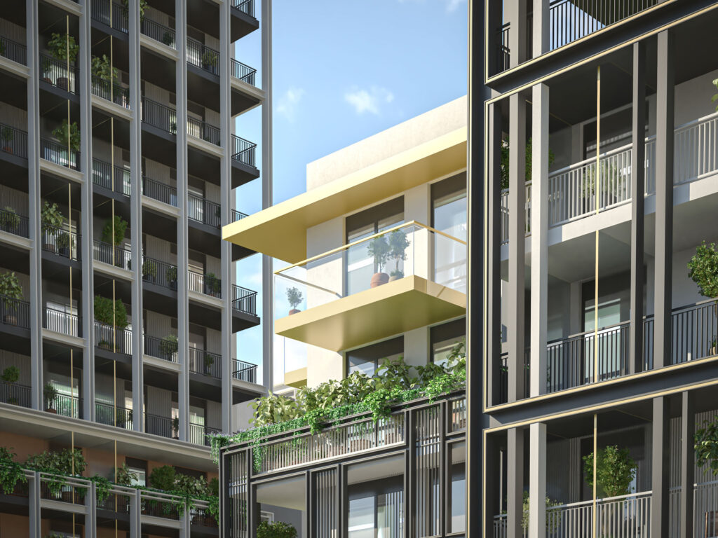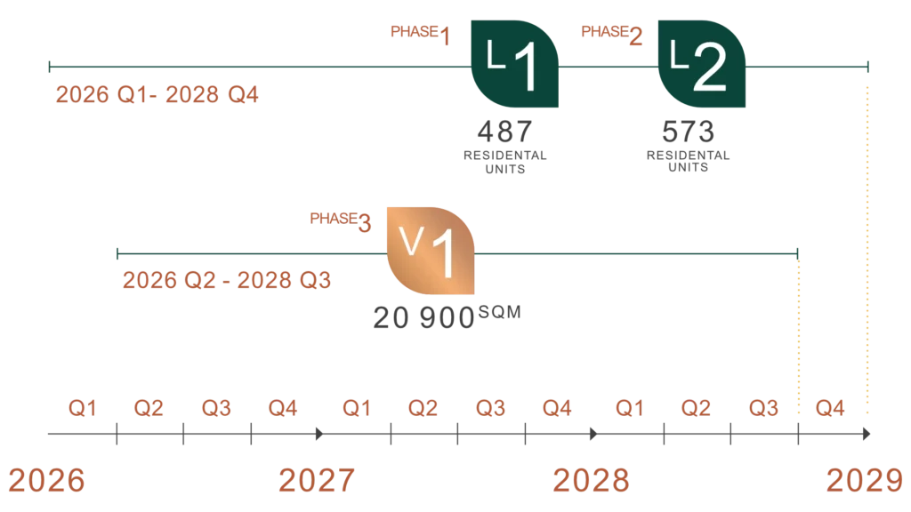 The project includes 2,600+ new apartments across multiple buildings, ground-floor retail units, a two-hectare park, and community and recreational spaces. A central promenade, playground, fitness park, cafés, and restaurants create a vibrant community experience.
